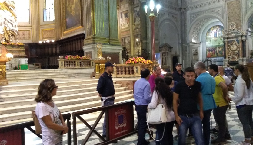 Na koniec, przed powrotem do Rzymu, całe popołudnie i wieczór pochodziłem w pięknych uliczkach Neapolu, zaglądając także na niektóre stacje tamtejszego metra, które są otwartymi galeriami sztuki. W związku z tym, że w tym czasie miało miejsce wspomnienie patrona miasta św. Januarego, wraz z celebracją sprawdzenia czy krew ze stanu stałego zmieniła się w stan ciekły, co ma symbolizować pomyślność dla Neapolu, mogłem podziwiać dekoracje na cześć patrona miasta (czytaj więcej >>>). Kiedy zaś dotarłem do samej katedry, to miałem w niej okazję ucałować relikwie Patrona Miasta w czasie specjalnego wieczornego nabożeństwa.